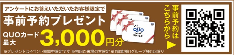 今なら、事前にご来店予約をしていただくだけで『QUOカード最大3,000円分』をプレゼント。